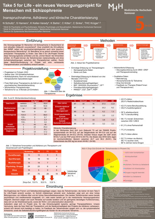 Das "Take 5 For Life" Versorgungsprojekt wird wissenschaftlich begleitet, um Erkenntnisse über Therapiemöglichkeiten für Menschen mit Schizophrenie zu gewinnen. Hierfür werden an drei Erhebungen Fragebögen durchgeführt, die uns helfen, die Wirksamkeit dieses Projektes zu untersuchen. Wir interessieren uns für Ihr Erleben und wie es sich während der Teilnahme im Projekt verändert.